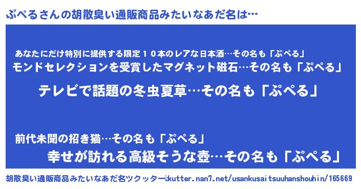 | 男性向けラノベタイトル風あだ名 | 『魔法科高校のぷぺる』『緋弾のプペル』 |