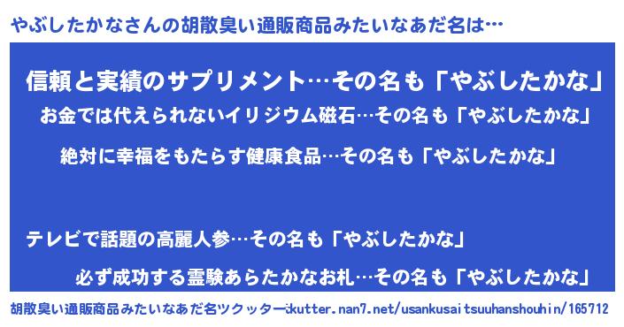 | 意味不明あだ名 | 『永久保存やぶしたかな』 |