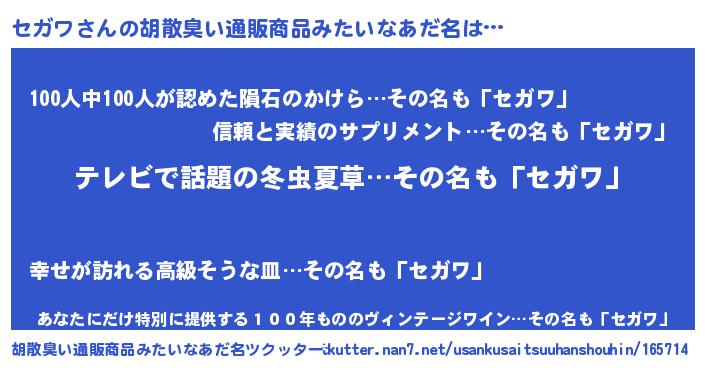 | 男性向けラノベタイトル風あだ名 | 『転生したらセガワだった件』 |