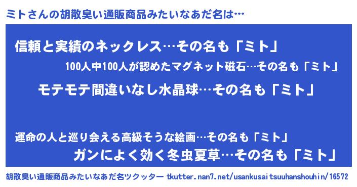 | 男性向けラノベタイトル風あだ名 | 『転生したらミトだった件』 |