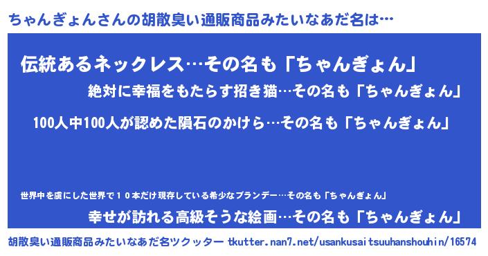 | 男性向けラノベタイトル風あだ名 | 『おまえをオタクにしてやるから、俺をちゃんぎょんにしてくれ! 』 |