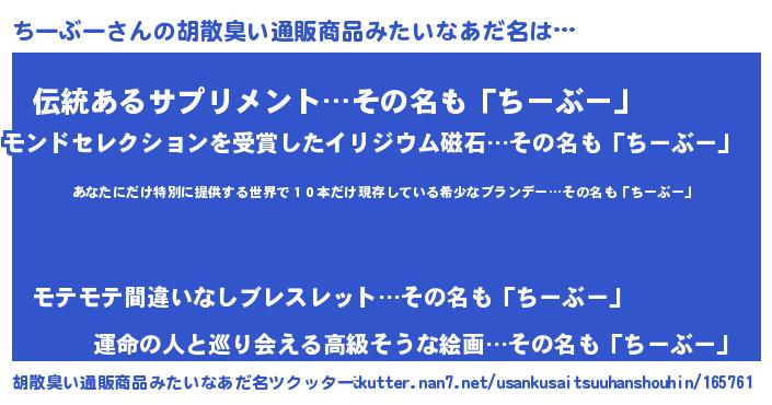 | 男性向けラノベタイトル風あだ名 | 『ちーぶー~年齢イコール彼女いない歴の魔法使い~』 |