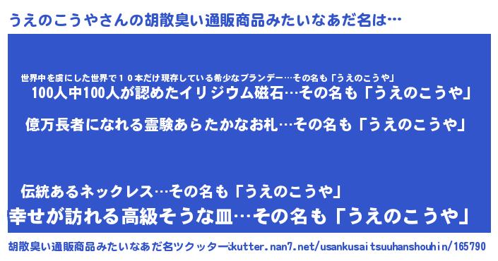 | 恥ずかしいあだ名 | 『プリティーうえのこうや』『うえっちょ』 |