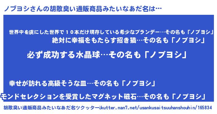 | ヘコむあだ名 | 『ノブにゅー』『ノブヨシ(爆)』 |