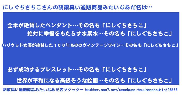 | 意味不明あだ名 | 『住所不定無職にしぐちさちこ(10歳)』 |