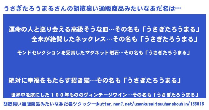 | 男性向けラノベタイトル風あだ名 | 『ノーゲーム・ノーウサギタロウマル』 |