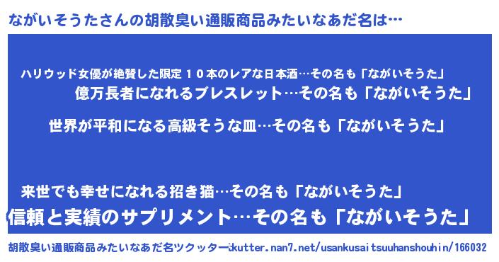 | 男性向けラノベタイトル風あだ名 | 『転生したらながいそうただった件』 |