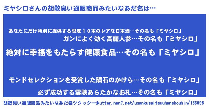 | 意味不明あだ名 | 『永久保存ミヤシロ』『ペロリンミヤシロ』 |