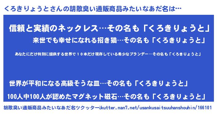 | 意味不明あだ名 | 『住所不定無職くろきりょうと(81歳)』 |