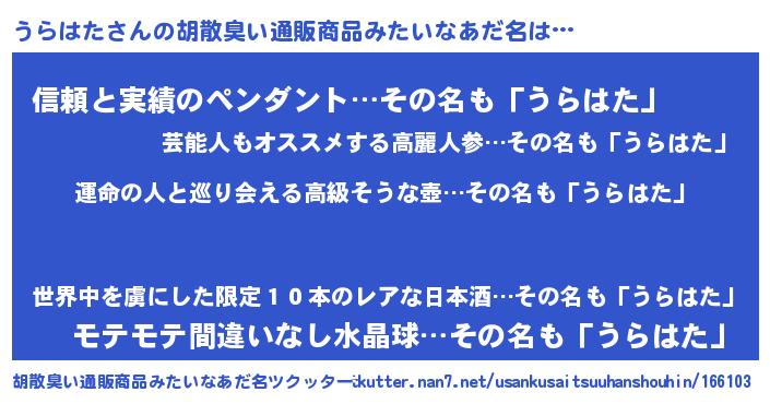 | 意味不明あだ名 | 『うらはたフォーエバー』『自称うらはた』 |