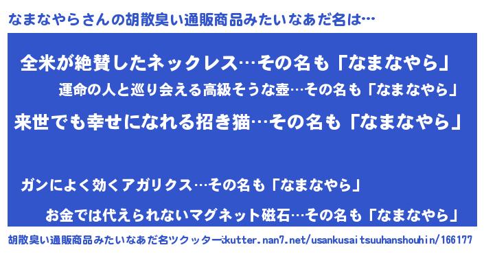| ヘコむあだ名 | 『なまなやら(笑)』『なま太郎』 |