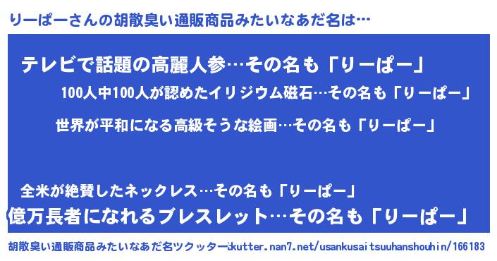 | 意味不明あだ名 | 『りーぱーフォーエバー』『自称りーぱー』 |