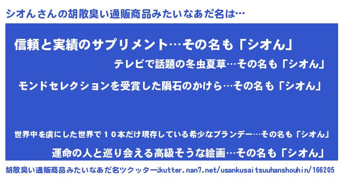 | 意味不明あだ名 | 『眠気覚ましガムシオん味』『自称シオん』 |