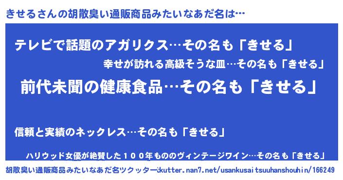| ヘコむあだ名 | 『きせる(笑)』『豆乳』『きせお』 |