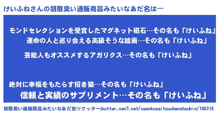| 意味不明あだ名 | 『自称けいふね』『けいふねフォーエバー』 |