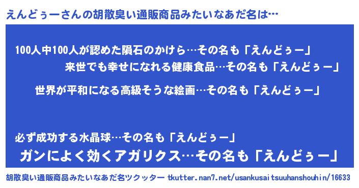 | 男性向けラノベタイトル風あだ名 | 『やはりえんどぅーの青春ラブコメはまちがっている 』 |