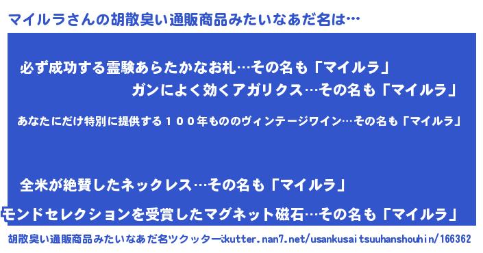 | 男性向けラノベタイトル風あだ名 | 『この素晴らしい世界にマイルラを!』 |