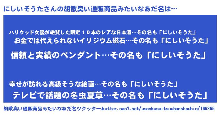 | 意味不明あだ名 | 『とにかく怪しいにしいそうた』 |