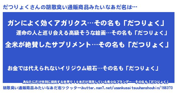 | 男性向けラノベタイトル風あだ名 | 『だつりょく~年齢イコール彼女いない歴の魔法使い~』 |