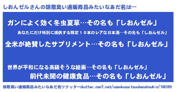 | 男性向けラノベタイトル風あだ名 | 『しおんゼルの嫁は女の子じゃないと思った?』 |