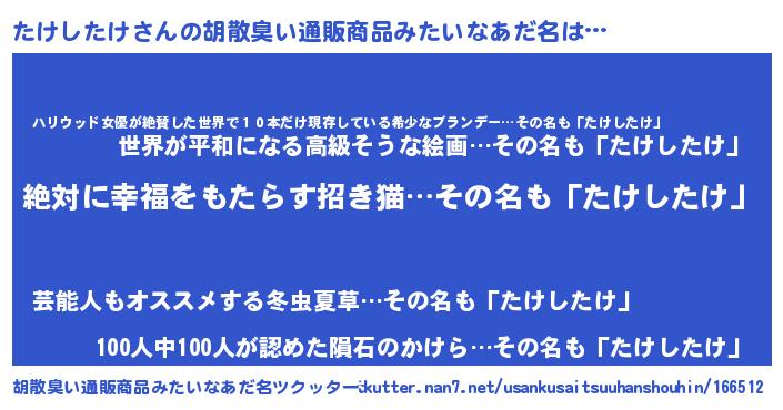 | 男性向けラノベタイトル風あだ名 | 『たけしたけという概念が存在しない退屈な世界 』 |