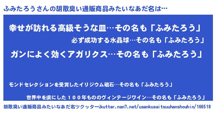 | 女子向けラノベタイトル風あだ名 | 『ふみたろうなんてお断りですっ。』 |