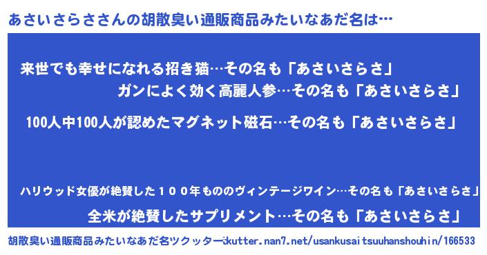 | ヘコむあだ名 | 『あさいさらさ(笑)』『あさお』 |