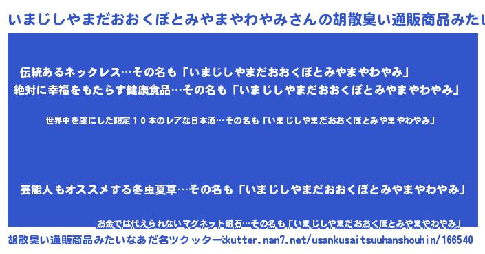 | 意味不明あだ名 | 『住所不定無職いまじしやまだおおくぼとみやまやわやみ(62歳)』 |