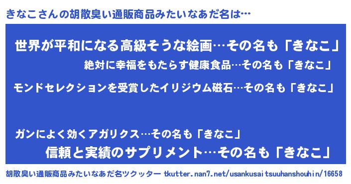 | ヒーロー風カッコイイあだ名 | 『天空の使者きなこ』『黄金騎士キナ』 |