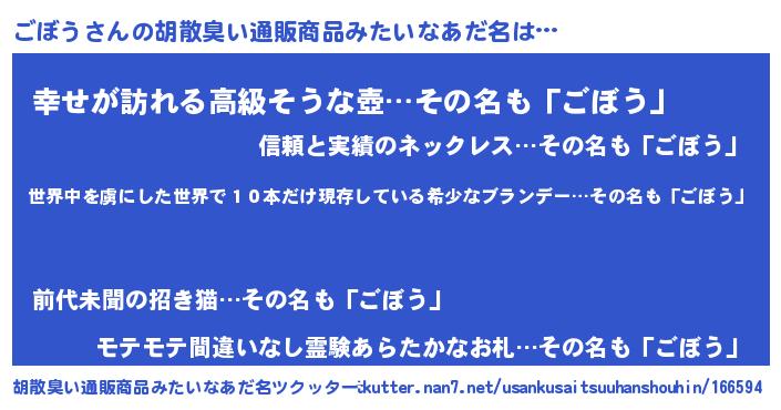 | 意味不明あだ名 | 『住所不定無職ごぼう(91歳)』 |