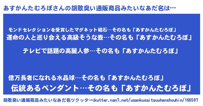 意味不明あだ名 | 『自称あすかんたむろぼ』 |