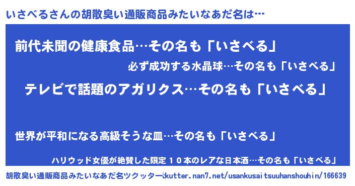 | 男性向けラノベタイトル風あだ名 | 『Re:いさべるから始める異世界生活』 |