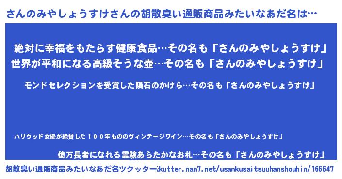 | ヘコむあだ名 | 『さんのみやしょうすけ(震え声)』 |