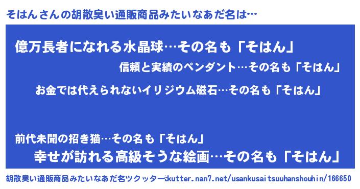 | 女子向けラノベタイトル風あだ名 | 『そはん恋絵巻』『そはん伯爵の花嫁』 |
