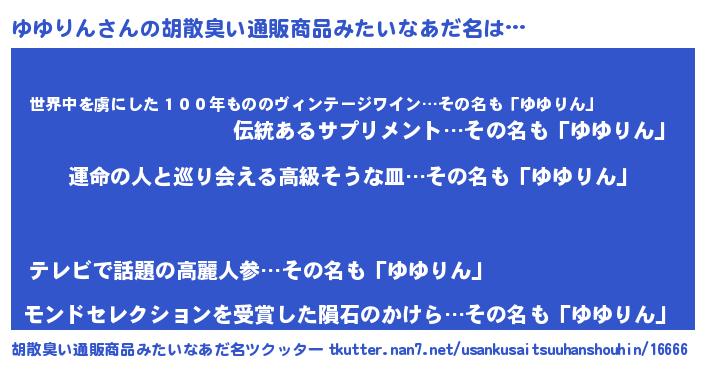 | 男性向けラノベタイトル風あだ名 | 『ゆゆりん~年齢イコール彼女いない歴の魔法使い~』 |