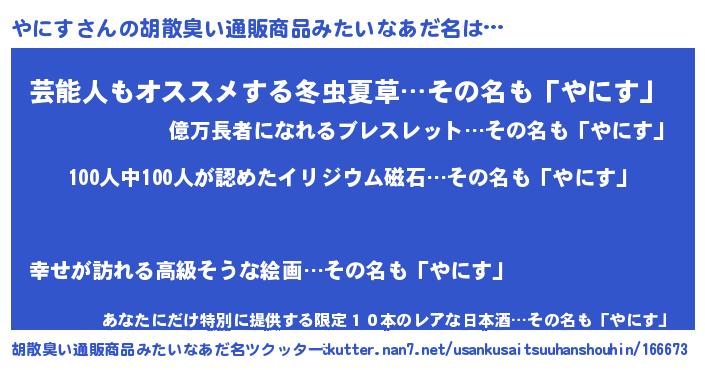 | 意味不明あだ名 | 『眠気覚ましガムやにす味』『自称やにす』 |