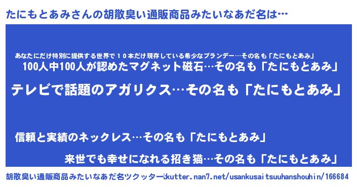 | ヘコむあだ名 | 『たにもとあみ(爆)』『たにお』 |