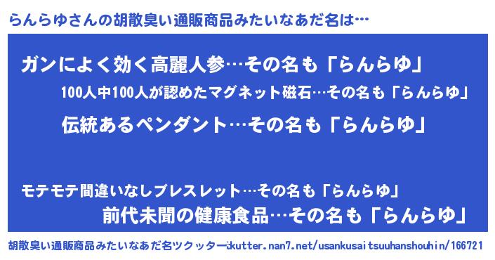 | 意味不明あだ名 | 『とにかく怪しいらんらゆ』 |