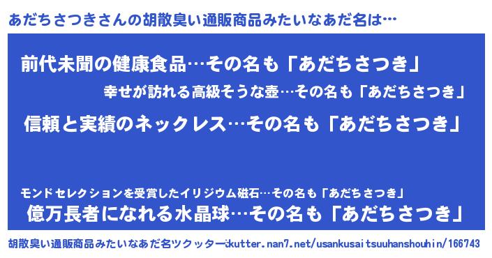 | 肩書あだ名 | 『あだちさつき中尉』『あだちさつき塾長』 |