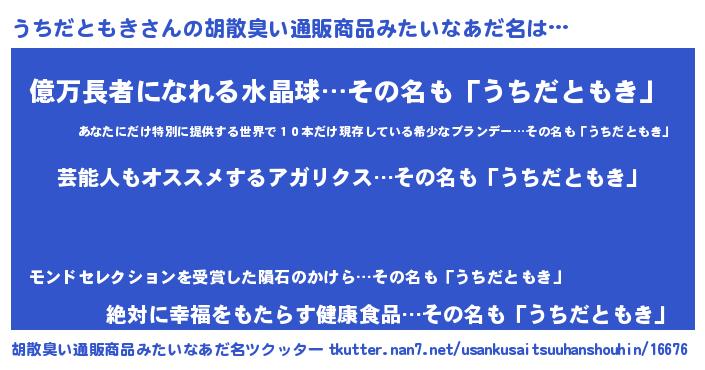 | ヘコむあだ名 | 『うちにゅー』『うちだともき(笑)』 |