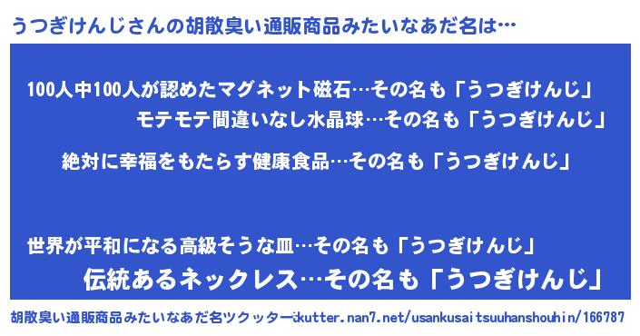 | ヘコむあだ名 | 『うつぎけんじ(苦笑)』『うつお』 |