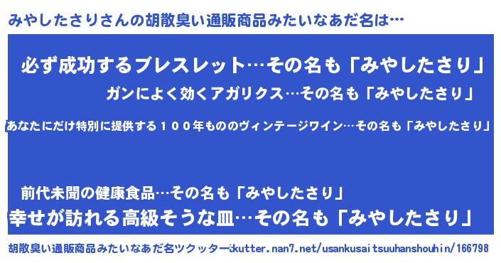 | 恥ずかしいあだ名 | 『プリティーみやしたさり』『みやっちょ』 |
