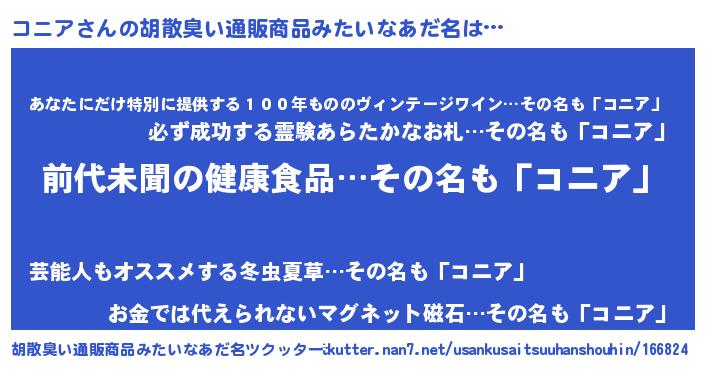 | 欧米人風あだ名 | 『アンジェラ・コニア』『ダニエルコニア』 |