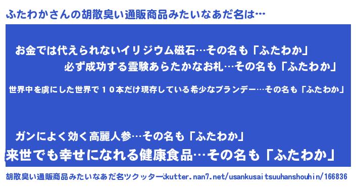 | ヘコむあだ名 | 『ふたわか(遠い目)』『ふたにゅー』 |