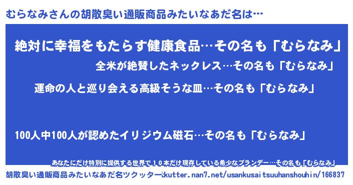 | ヘコむあだ名 | 『レバニラ』『むらなみ(爆)』 |