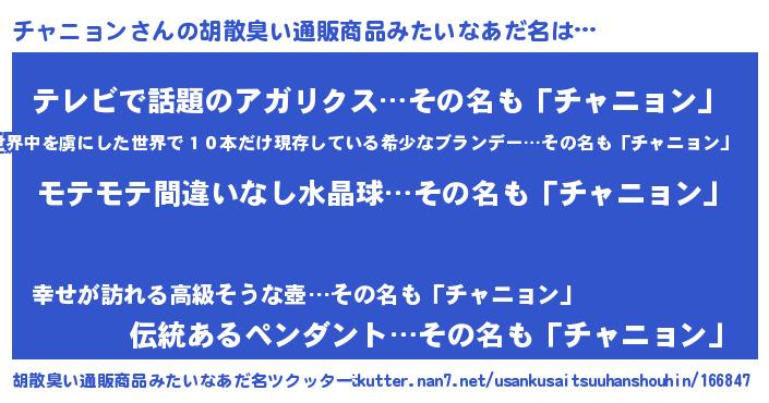 | ヒーロー風カッコイイあだ名 | 『スーパーチャニョン』『黄金騎士チャ』 |