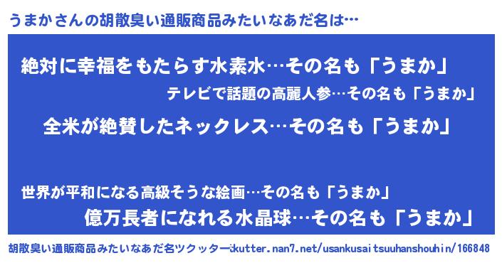| 欧米人風あだ名 | 『ウサインうまか』『アンジェラ・うまか』 |