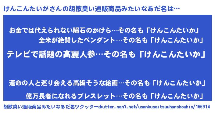 | 男性向けラノベタイトル風あだ名 | 『転生したらけんこんたいかだった件』 |