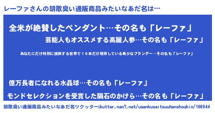 | 意味不明あだ名 | 『住所不定無職レーファ(98歳)』 |