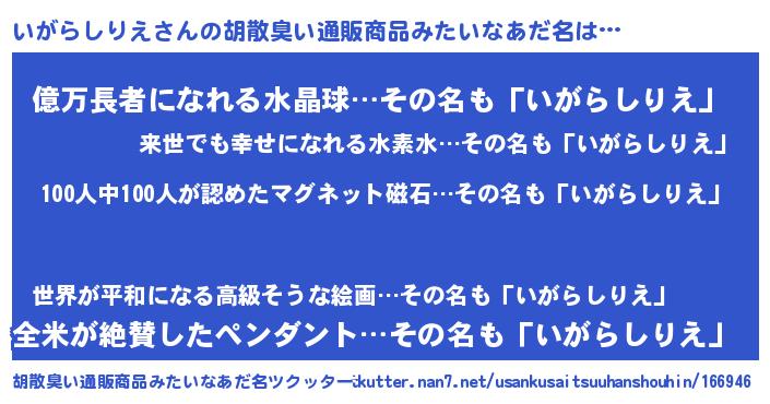 | 男性向けラノベタイトル風あだ名 | 『おまえをオタクにしてやるから、俺をいがらしりえにしてくれ! 』 |